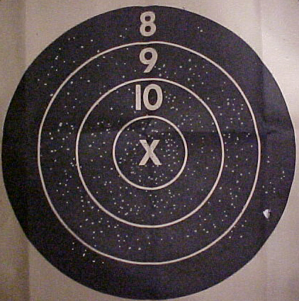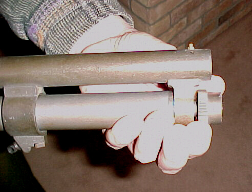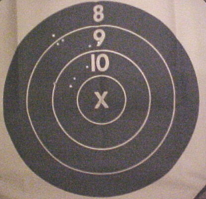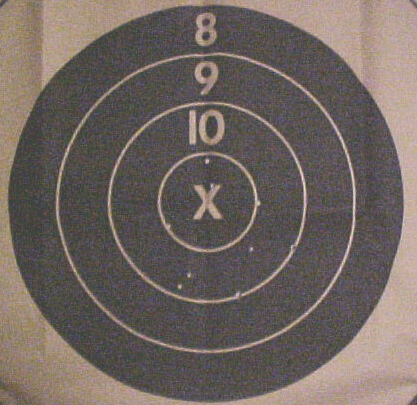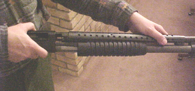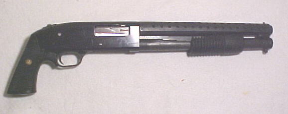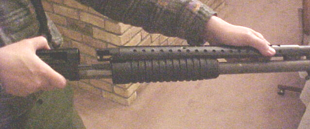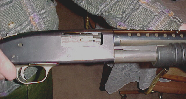 MECHANICS: The bolt contains a cammed block which locks into a cut on the barrel extension. The actual lockup appears to be nearly identical to an older Stevens pump gun, save that the Stevens employed an actual cut through the roof of the receiver. The trigger group itself is modular, and retained by springloaded pins. It is a marvel of efficient use of space, and, like the rest of the gun, it contains nothing in the way of fine milled forgings. Parts are either polymer, sheet steel stampings, or castings. Disassembly is straightforward, reassembly is of Byzantine complexity. Indeed, it may be impossible for one person. The receiver is a milled aluminum forging, but one suspects it is forged very close to finished dimensions. TEST GUNS: The test guns are: (1), A 1979 vintage military trench gun, the model 500-ATP-8SP, essentially an early model 590, and (2), A Cobray "manufactured" Any Other Weapon styled as "The Rogue". The trench gun carries a full buttstock, a lug for M7 bayonet (M16 type), heatshield and 20 inch cylinder barrel. The Cobray carries a Pachmayr Vindicator pistol grip (thank God for small favors), a 12 inch, heatshielded barrel, a severely foreshortened magazine, slide handle and a world of bad attitude. This would be, if locally legal, the paradigmatic nasty car gun. The trench gun was purchased new in the fall of 1979. In the period since, it has been shot until the wooden buttstock cracked, the plastic safety button shattered, the magazine follower began to split, and the finish turned crusty. The safety was replaced with an aluminum button crafted by the late Jack Clark (see my Remington 700 article). None of this happened precipitously though, as it has had over 5,000 rounds of full charge 12 gauge run through it. The Cobray is a 1985 vintage gun, legally assembled as an Any Other Weapon on a Mossberg receiver. The barrel, magazine, action bar handle and action bar are specific to this series. Miles later added an additional 15" barrel cut to length and finished by his dad so as to get that one extra round available with the standard length magazine. Cobray manufactured these guns for less than 2 years. By Law these are Any Other Weapons by virtue of original "manufacture" with short barrel, but with out buttstock. Legally it is a type of smoothbore pistol. SHOOTING The 500 trench gun handles approximately the same as any other extended magazine riot gun. The excellent tang safety falls quickly to hand for activation, and is more or less ambidextrous. The action release is located at the rear of the trigger guard, and while presumably designed for right-handers, left-handed Miles finds both a satisfactory arrangement. Recoil is on a par for a 6.5 pound pump 12 gauge. The buttstock is well shaped, the Choate replacement duplicating the drop and pull of the long gone "walnut stained hardwood". Personal opinion is that you are in no danger of your teeth popping out. The shorty is another story. The original manufacture pared away more than two pounds. Every ounce not there is felt in firing. The gun is a hard kicker, and recoil goes straight to the web of the hand. 3" magnums require a supported firing hand-usually the hand is braced against the hipbone. Even standard 2 3/4" field loads are unpleasant pretty quickly. It has perhaps 100 rounds run through it. I admit it. Miles and I have run BRI sabot slugs through it. 1 round each. PERFORMANCE We herewith reproduce patterns fired at 20 yards using Winchester 2.75" #6 field loads, and 00 buck. We attempted to use the 2" Aguila ultrashort round, which proved a tangle of feed problems, as the ammo box itself warned. The Aguila testing was suspended. Not a lot to say here. These guns pattern like cylinder bored 12 gauges. ( as always, larger images are available if you click on them.) The "12x12" (as A.K named it years ago)As you can see, the length of the barrel really doesn't have a lot to do with pattern size. DISASSEMBLY Make sure the gun is unloaded. Both the chamber and the magazine. This is for field stripping. Detail stripping is more involved, and will not be fully covered here. (1) Retract the bolt about an inch. This disengages the locking lug from the barrel. (2) Unscrew the barrel retaining cap attaching the barrel to the front of the magazine tube. (3) Pull the barrel off the gun. (4) Field stripping is complete, and reassembly really is in reverse order. This ease in disassembly has also allowed the type to be one of the more versatile shotguns available. One can simple purchase different barrels and change them for the intended purpose. They are available from 18 1/2 inch length and longer for different hunting and social activities. OPERATION Loading port is located in the typical bottom of receiver location. Magazine capacity will vary between 2.75" and 3" rounds, the latter will reduce capacity. The test guns have magazine capacities of 8 and 4 rounds of 2.75" respectively. Action release is located on the operator's left at rear of trigger guard. Pressing upward will allow the forend to be retracted. Shuck the forend rearward vigorously, pull it back forward, and gun is loaded. The safety is located at top rear of the receiver. Pushing it forward is the "fire" position, rearward is the "safe". DETAIL STRIPPING There are some mildly complex procedures which do not lend themselves to digital photography. For this reason we have not opted to include these instructions. They are laid out in the owner's manual. The trigger group is beyond mildly complex to reassemble. Mine was replaced after we gave up on reassembly. Theoretically Mossberg restricts the trigger/hammer module to factory replacement only-Gun Parts Corporation, last I was aware, will sell the part to anyone. They sold it to me, anyway. In general, detail stripping will only be required if the gun has been fired a great deal, or in the unlikely event of required parts replacement. The Mossberg is right tolerant of dirt and filth. Aerosol solven