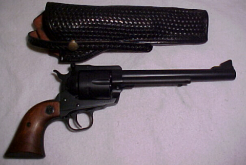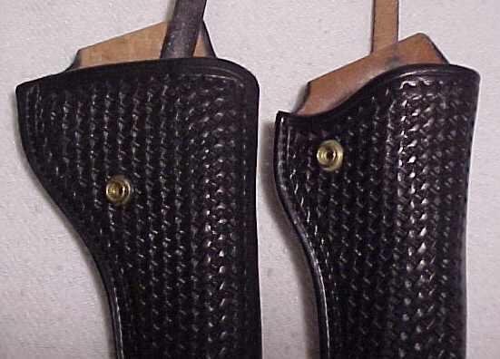 Note that nothing there is really gilt edged, or really horrible. The Cor-Bon load @ 1050-1100fps did certainly give the best group of the day. I've made some New Year's resolutions; 1, Everything shot, except the Nosler load could be used safely in a 2nd-3rd generation SAA. I'd like to try some hotter stuff like the 300 grain flat point over W296-H110 type loads. I don't need it in my part of the world, but you never know where you might end up hunting. 2, The bore has gotta' be lapped. I'm impatient with shooting jacketed ammo, and this bore has GOT to be slicked up. So I imagine B & J Guns & Ammo will be called on to do this simple procedure. This will be the first actual gunsmithing the revolver will receive. The revolver was purchased specifically to carry during Midwestern whitetail hunting. During a proper deer season the weather is uncomfortably cold, and usually damp and foggy. 1999 was semi-tropical, and was an exception. The revolver WILL get wet and I don't like flapped holsters, so it has been refinished in matte black DuraGuard. A close look at the finish. This is a super corrosion resistant finish, attractive enough and resembling dull bluing with a little graphite thrown in. It won't rust doing anything I'll ever do with it. My article on the shorty New England .357 mentions more on that finish in its shinier variation. I will also mention that my holster for this gun is an R D Maker one-off. It is a mixture of Threeperson and Keith/Lawrence 120 design. It is a pretty open holster, and that is not what I want for the hunting revolver. I've come up with something which might just be better. Here's a side by side view of the two holsters I prefer something more protective. A later variation I tried for my Single Six, and also seen in it's article seems more like it, and needs to be duplicated for the big revolver. Trigger guard exposure is nil. It is more protective of the revolver, and suits my needs. Finish is black basket weave. I like basket weave, as I believe it shows fewer scratches. I'm very happy with it, as I am with my .45.