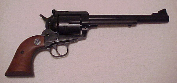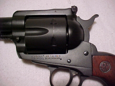 MY RUGER NEW MODEL BLACKHAWK .45 L.C. As always, click on an image to see a larger one. Free permission to quote Church's articles is granted, as long as proper attribution is given. We request that if you use our work, you give us credit. According to the serial # data, my Blackhawk first saw daylight in 1983. It was obtained from a "GUN LIST" classified ad, and was 10 years old when I got it. The revolver is a carbon steel 7 ½" bbl version. When purchased it was advertised by a Seaford, Long Island, New York dealer as being "at least 90%", and when delivered proved far better than that. The history was that it was from an estate out of Staten Island, New York City. A peculiar history for a big bore sixgun, but these gentlemen were super honest about the condition, and @ $200, it was priced slightly lowball. For the record, the revolver was box stock. I liked (and still like) the longer barrel for the ballistic advantage, sight radius, and balance. Factory grips of indifferent wood and indifferent finish were fit well, and are still in place. The trigger pull was a little heavy. One side of the trigger return spring was unhooked, and the trigger pull was immediately reduced to something acceptable. DISCLAIMER: DO THIS AT YOUR OWN RISK. I know nothing of its shooting history before I took possession. It has been described as being shot very little, and exterior condition, razor sharp forcing cone and chamber mouths seem to bear this out. I shoot very little factory ammo in .45 Colt. Usually, for plinking, I use the plain base Lee 452-252-SWC mould cast as hard as possible, over 8 grains of Unique, and for my less and less frequent backpacking and woods loafing extravaganzas I stuff in one more grain of Unique. 9 grains of Unique, a 250ish SWC, a Winchester large pistol primer, and whatever cases I have without neck splits are about as classic a hand load as the 127 year old cartridge has. The 9 grain load essentially duplicates the original black powder ballistics of the cartridge. DISCLAIMER: ALL HAND LOADS ARE AT YOUR OWN RISK. THESE LOADS ARE PROVEN SAFE IN MY HANDGUN, BUT I HAVE NO CONTROL OVER YOUR USE. CERTAINLY THESE HAND LOADS ARE NOT FOR 19th & EVEN SOME 20th CENTURY REVOLVERS. I'M NOT ADVOCATING YOU DUPLICATE THESE. I'M JUST TELLING YOU WHAT I'VE DONE. READ THE MANUALS, OBSERVE THE PROCEDURES, KNOW WHAT YOU'RE DOING. AND, DON'T BLAME ME OR THE MILES FORTIS IF YOUR GUN TURNS INTO AN ILLUDIUM Q36 EXPLOSIVE SPACE MODULATOR. For carrying as a rifle backup, pursuing the wiley whitetail, I usually carry the above bullet, in more carefully chosen cases, over 17. 5 grains of IMR 4227. This isn't much hotter than the 9 grains of Unique, but it's a little more accurate. Initial shooting sessions revealed several things. First, this revolver seemed to have no strong preferences in loads. A number of bullet weights, plinking loads, and heavier hunting loads all gave the same rough level of accuracy. Second, the complaints about Rugers having sloppy oversize chambers and rough bore finish are, at least in my revolver, absolutely true. This one works the brass hard, and leads the bore pretty badly. I took to shooting a fair bit of jacketed ammo to slick it up and, after a couple of hundred rounds, it is partially accomplished. It still wants hard bullets with good lube, or I have to get out the de-leading cloth. Cases are typically good for 2 reloads, and then will begin the classic mouth split. I'll still shoot 'em with the slight splits for tin can ammo, but usually that'll be the last load you get out of the case. I haven't kept good documentation on this, but my sense is that Federal hulls live longest, Remington the shortest, and Winchester somewhere in between. I've not used enough Starline to have an opinion. I was recently given a quantity of "Cowboy" factory loaded ammo from one the big boys, and the soft bullets smear lead promiscuously. I won't mention the brand of that ammo, since I am told later production has harder bullets. This is, by the by, the second box of factory I've ever run through it. The other was a box of CCI Blazer purchased once when I got to my destination with the big Ruger, but without hand loaded .45 cartridges. I know nothing about the accuracy of that load as it was all burned up by my fearless nephew, the Justinator, then 11 years old. So much for the intimidating recoil of the big round… Here is some accuracy data for the revolver. Ammo supplied by B&J Guns & Ammo & fired on the J barT Ranch pistol range by the Miles Fortis without any sight adjustment. All fired @ 50 feet off a rest at a standard pistol target. I've not yet played with any of the +P ammo loaded by specialty manufactories like Buffalo. The Winchester factory stuff will kill all the lower Midwestern whitetails I'll ever encounter, and is quite pleasant to shoot. The hand load uses Winchester's large pistol primer Nosler 250gr JHP 22gr H110